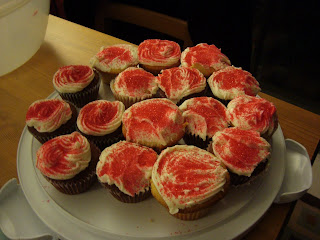 My friend made these happy chocolate and vanilla with vanilla frosting and red sparkles cupcakes for a party recently, and they were delightful. Thanks, C!